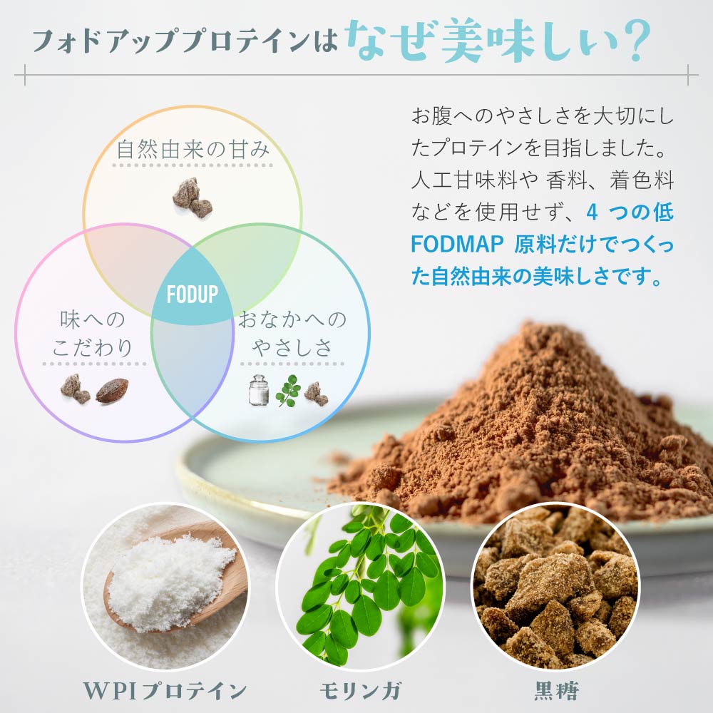 プロテインには、人工甘味料や香料、着色料などが入ったものが多くありますが、FODUP プロテインは添加物を使用せず、低FODMAP原料だけで作ったシンプルなプロテインです。
