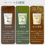 【カカオ】 ■エネルギー:111kcal ■タンパク質:12.9g ■脂質:0.8g ■炭水化物:14.3g ■糖質:11.8g ■食物繊維:2.5g ■食塩相当量:0.11g 【抹茶】 ■エネルギー:112kcal ■タンパク質:13.4g ■脂質:0.2g ■炭水化物:15.0g ■糖質:13.3g ■食物繊維:1.7g ■食塩相当量:0.08g 【ほうじ茶】 ■エネルギー:109kcal ■タンパク質:13.4g ■脂質:0.2g ■炭水化物:14.5g ■糖質:12.2g ■食物繊維:2.3g ■食塩相当量:0.11g |