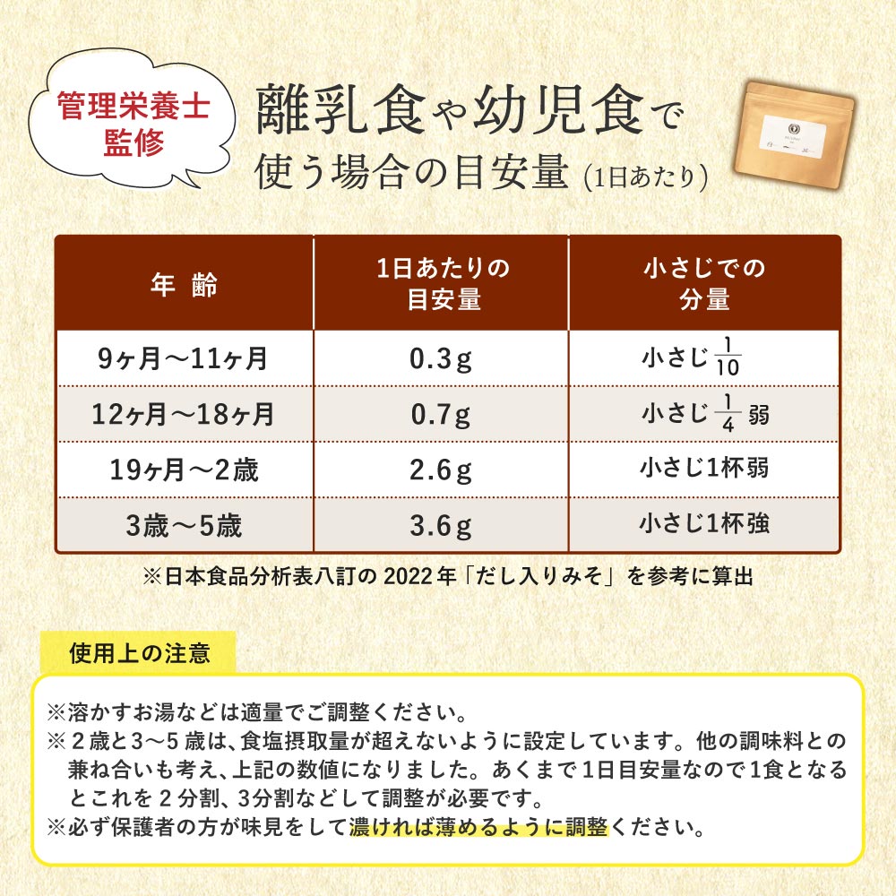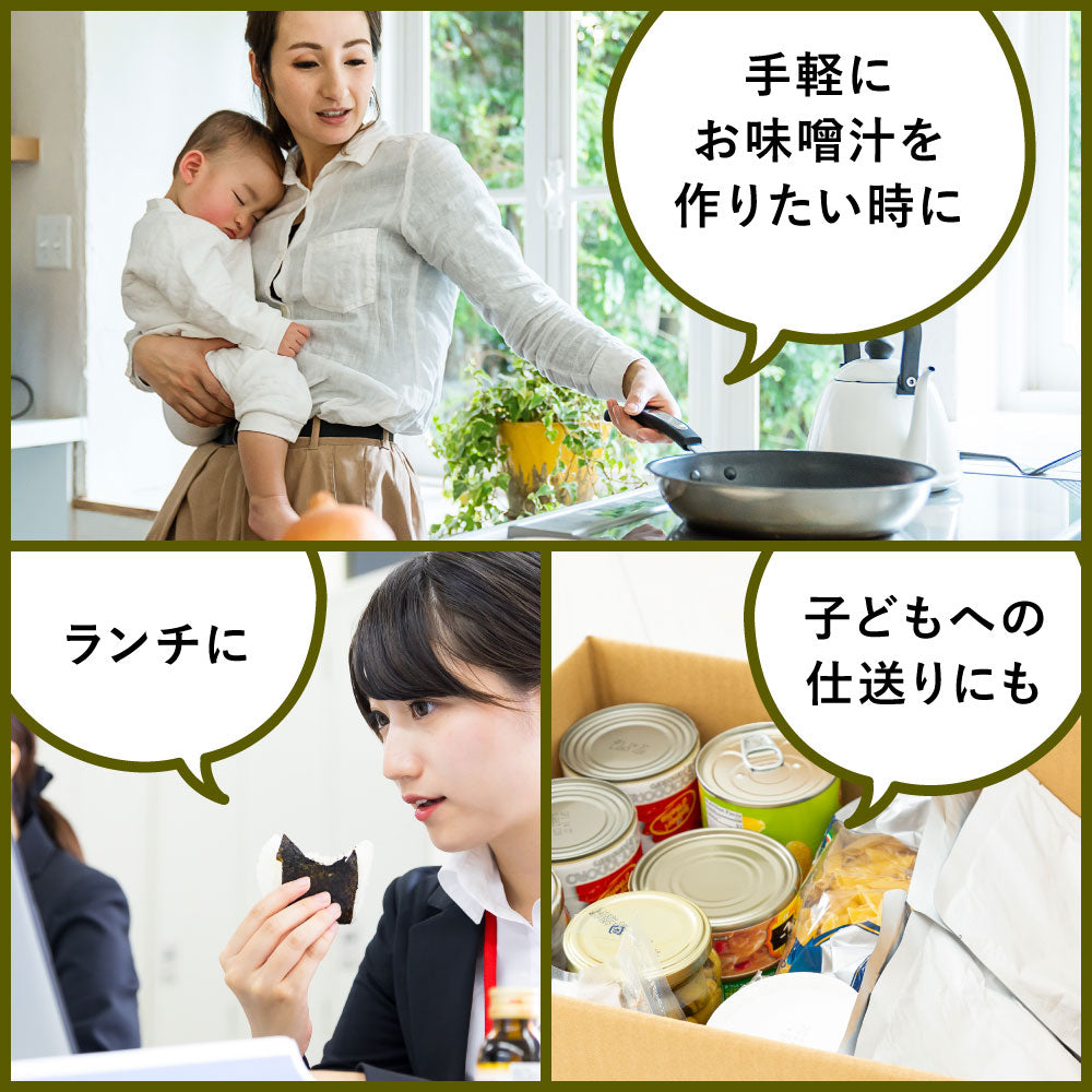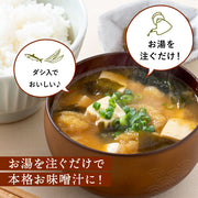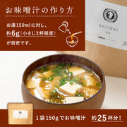 | お湯150g に対して、約6g(小さじ2杯程度)が目安です。 お味噌汁以外にも、パンやご飯、サラダなどに振りかけてお召し上がりください。 |