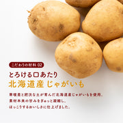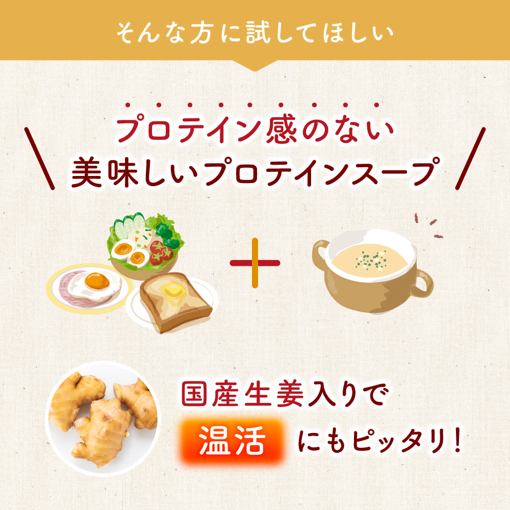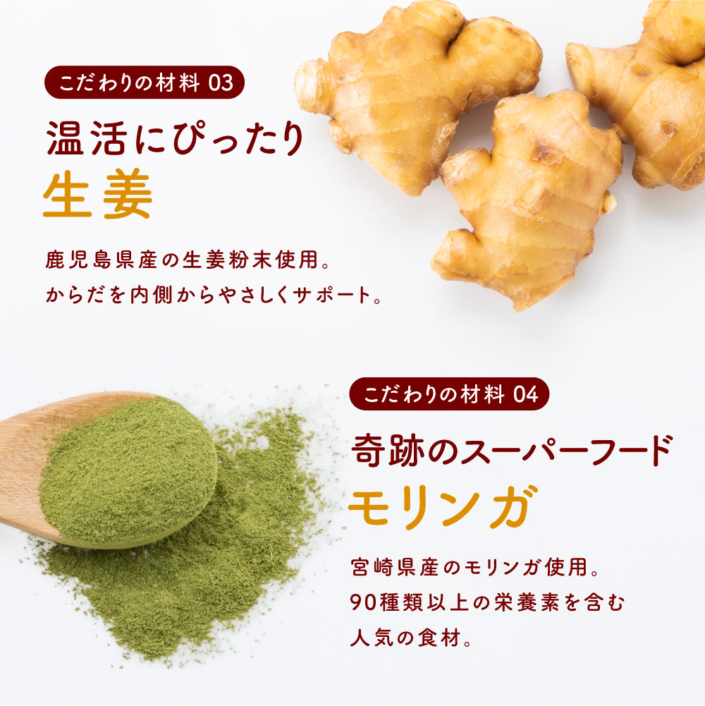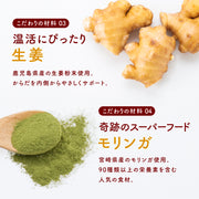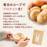 原材料名:ポテトポタージュパウダー(じゃがいもパウダー、デキストリン、コーンスターチ、砂糖、野菜ブイヨンパウダー(食塩、砂糖、酵母エキスパウダー、オニオンパウダー、マッシュポテトパウダー、醤油(大豆・小麦を含む)、馬鈴しょでん粉、人参粉末、フライドガーリック、コショウ)、脱脂粉乳、食塩、オニオンパウダー、酵母エキスパウダー、コショウ、ローレルパウダー、うきみ(パセリ))(国内製造)、植物性たん白、乾燥ポテト、オニオンパウダー、チキンエキスパウダー(デキストリン、チキンエキス、食塩、酵母エキスパウダー)、イヌリン、生姜粉末、ガーリック、ホワイトペッパー、モリンガ末、食塩、(一部に乳・小麦・大豆・鶏肉を含む)