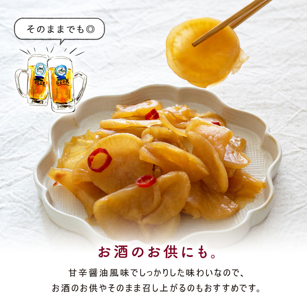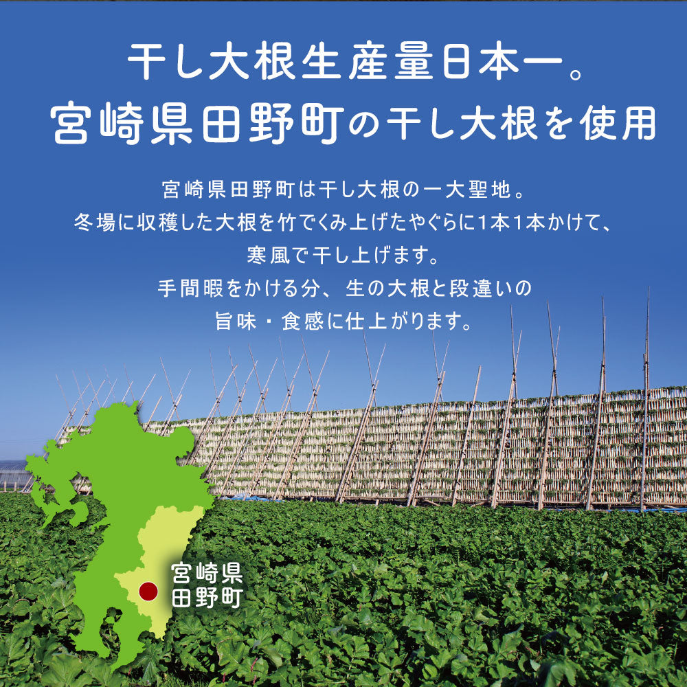 | 干しだいこん、漬け原材料[果糖ぶどう糖液糖、食塩、しょうゆ、醸造酢、酒精、とうがらし、ぬか類]/調味料(アミノ酸等)、カラメル色素(※天然色素)、(一部に小麦・大豆を含む) |